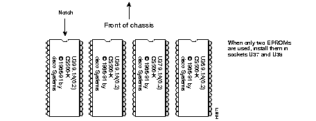 Step 4: Insert the new EPROMs; a label on each EPROM shows the correct socket, along with a byte designator label you can use to identify the correct socket (see Figure 4-10). If you are installing only two EPROMs, install them in sockets U37 and U38. When you insert each component, align the EPROM notch with the notch in the socket. Figure 4-10 illustrates the correct orientation of the EPROMs. The notched edge should be closest to the front of the chassis.