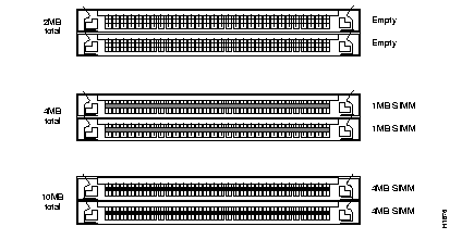 The 500-CS contains two megabytes of RAM permanently soldered onto the system card. The two RAM expansion sockets, U39 and U40 (see Figure 4-1), allow you upgrade your server RAM to four megabytes (by adding two 1-megabyte SIMMs) or to ten megabytes (by adding two 4-megabyte SIMMs). The two expansion slots must both be empty, or both be populated with SIMMs of the same size and speed. Each of the three options is illustrated in Figure 4-3. Memory upgrade kits are available from your local sales representative or customer service; refer to the "Service and Support" section in the front of this guide for ordering information.