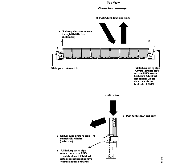 ![]() | Caution The SIMM requires firm pressure to release it; however, if you feel too much resistance, do not force the SIMM, or you might damage it. Look straight down on the SIMM as you push the metal tabs out; the side of the SIMM must clear the metal tab before it can be pushed back. |