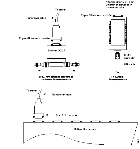 Some transceivers attach directly to the 15-pin Ethernet port on the server. Others require a transceiver cable between the server and the transceiver. Figure 2-3 shows examples of different types of transceivers.