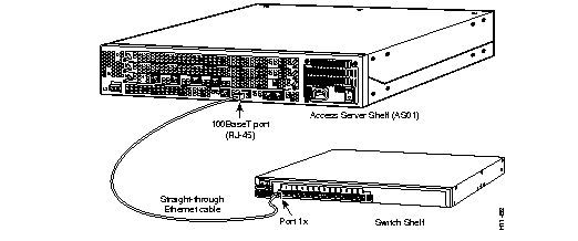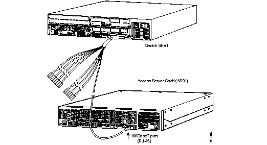 Step 1 Each of the Access Server Shelves is connected to an Ethernet network by connecting the 100BaseT port to the corresponding port on the Switch Shelf. Connect each of the Access Server Shelves to the specified port on the Switch Shelf using the appropriate RJ-45 to RJ-45 cable (see Figure 7).