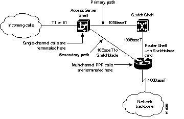 For example, an Access Server Shelf has two lines. In a T1 configuration, each of these lines can handle 23 calls (23B+D). The maximum configuration of 12 Access Server Shelves provides a maximum capacity of 552 ISDN PRI calls. The calls are aggregated in the Switch Shelf and multiplexed and sent over a 100BaseT Fast Ethernet connection to the Router Shelf.