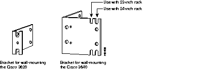 Each router ships with one set of brackets. Brackets for 19-inch racks are shipped unless you specify 23-inch or 24-inch brackets at the time of your order. The Cisco 3620 router requires 19-inch rack brackets to mount on a wall, and the Cisco 3640 router requires 23-inch or 24-inch rack brackets to mount on a wall. Figure 8 shows the wall-mount brackets.