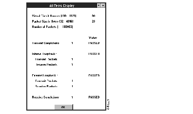 The All Tests Display window shows the test parameters you specified in the Test Setup window, as well as the current test status. If an error occurs or packets are not received, a message box appears.