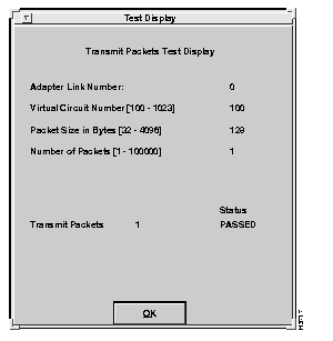 The receive test requires that another node be transmitting packets on the same VC. If another system is not sending data to the system, the test times out in 20 seconds and a message box is displayed.