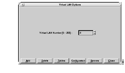 The Virtual LAN Options window appears, as shown in Figure 6-13. This window provides access to the configuration and management facilities for virtual LANs. Choose a virtual LAN number.