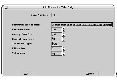 An ATM ARP server table must be defined to collect and maintain information required for virtual LAN operation. This window controls how the connection to the ARP server is set up.