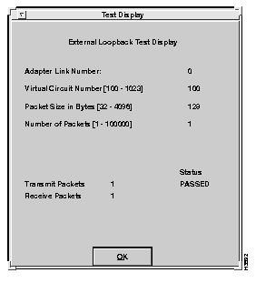 The External Loopback test transmits and receives ATM packets through the local ATM interface connector. A loopback cable is required. If an error occurs during a test or a timeout occurs, a message box indicates the problem.