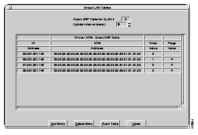 A client ARP table is located on each ATM client. After a virtual LAN is initialized, ARP table entries may be added or removed. There are two possible configurations: