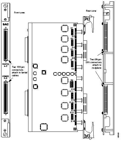 Figure 1-32 shows front, rear, and component side views of the T1 CEMAC. Figure 1-33 shows front, rear, and component side views of the E1 CEMAC.