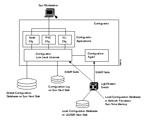 The configurator applications run under Motif/X11 or HP OpenView. As shown in Figure 1-1, the configurator applications write to the configuration database on the NMS workstation's hard disk through low-level libraries. The configuration agent, cfg_a, translates the database information into Simple Network Management Protocol (SNMP) set commands that send the information to an LS2020 switch; this is called an update. The configuration agent produces log files for each update of each switch, which are stored on the workstation's hard disk. The configurator applications can also retrieve configuration information from an LS2020 switch through SNMP get commands.