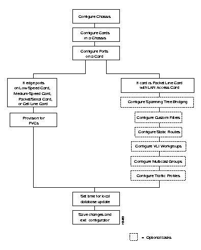 Figure 1-4 shows the steps you follow to create a configuration for a new switch. You begin configuration by creating a chassis object, assigning it a name, and filling in the chassis ID, IP addresses, and so on. You then create card objects within the chassis and ports for the cards.