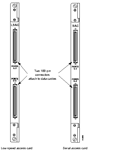 The low-speed access card (LSAC) and the serial access card (SAC) use the same types of connectors and cables for hookup. These interconnection facilities are described in the following order: