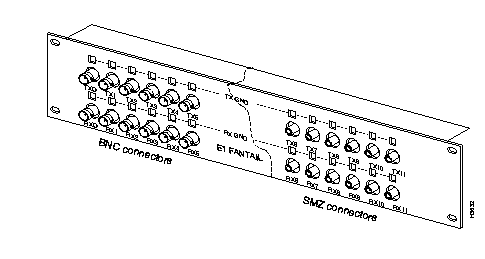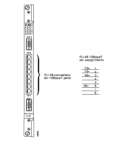 Figure 3-29 shows the bulkhead view of the Ethernet access card, which includes eight RJ-45 connectors and two attachment unit interface (AUI) DB-15 connectors. The RJ-45 connectors are used for the twisted pair Ethernet (10BaseT) ports.