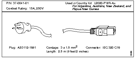 Each AC country power kit consists of a plastic bag containing a country-specific AC power cordset and sufficient attachment hardware for use in the 12 mounting slots in an LS2020 rack.