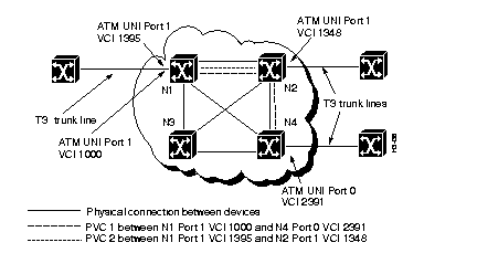 Figure 3-1 shows two ATM UNI PVCs: PVC 1 and PVC 2. In this particular network configuration, it is not necessary for switch N1 to segment incoming traffic from the T3 trunk line into ATM cells, since the traffic exists as ATM cells on arrival from a neighboring network. However, switch N1 must examine the VCI values in the arriving ATM cells in order to determine the PVC on which the traffic should be relayed. Each incoming cell is then passed appropriately through the network on the specified PVC.