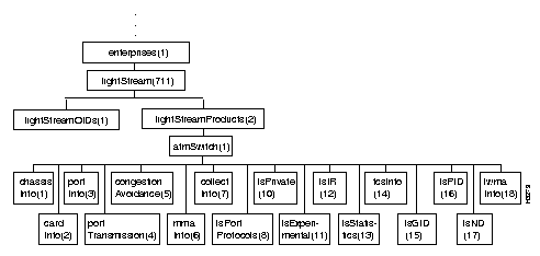 Figure 7-21 shows the lightStreamVli subtree in the LS2020 private MIB. (The lightStreamVli object is defined near the beginning of the MIB file.)