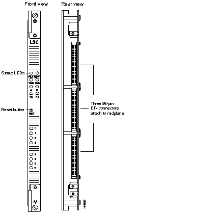 The V.35/RS-449/X.21 low-speed access card (LSAC) operates in conjunction with the low-speed line card. Figure 2-17 shows front and rear views of the low-speed access card.