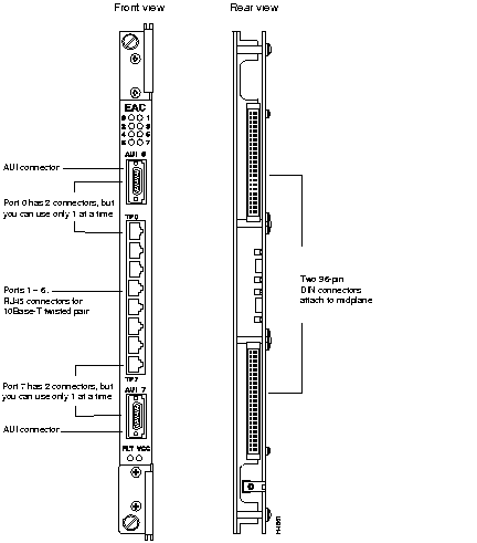The LEDs on the EAC are described in the appendix "LEDs." Figure 2-8 shows the front and rear view of an Ethernet access card (EAC).