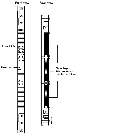 E3 medium-speed access cards (which are labeled MSAC) operate in conjunction with medium-speed line cards. E3 access cards support up to two ports each. Figure 2-19 shows front and rear views of an MSAC.