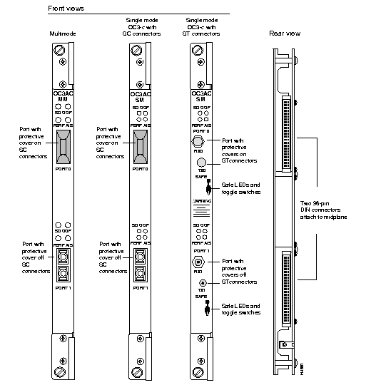 The LEDs on OC-3c access cards are described in the appendix "LEDs." Figure 2-3 shows front and rear views of the different types of OC-3c access cards.