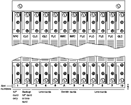 The list below outlines the types of cards that can be installed in each slot in the front of an LS2020 chassis. Figure 5-7 shows the slot numbers.