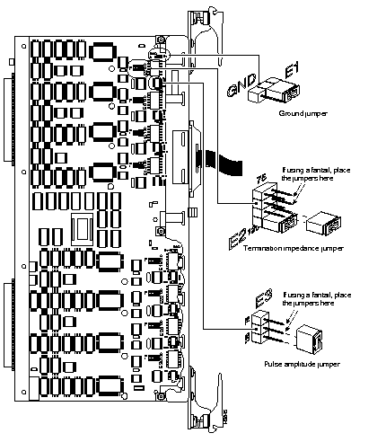 If you use a fantail, the CEMAC card must be set to use 75-ohm settings for termination impedance and pulse amplitude. This can be set by putting the termination impedance jumpers on the leftmost pins (the pins farthest away from the bulkhead) and putting the pulse amplitude jumper on the upper pins. See Figure 5-2.