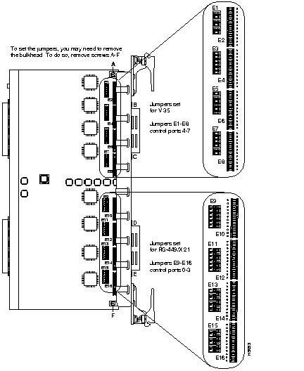 Figure 5-1 shows a card configured to provide RS-449/X.21 interfaces for ports 0 to 3 and V.35 interfaces for ports 4 to 7.