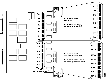 Figure 5-3 shows the location of the 16 sets of interface jumpers on the card, and illustrates how to set them. In this illustration, the card is configured to provide RS-449/X.21 interfaces for ports 4 through 7, and V.35 interfaces for ports 0 through 3. For V.35, the jumpers are put on the left and center pins. For RS-449 and X.21, the jumpers are put on the right and center pins.