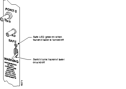 Single-mode ports on the OC-3c access card with ST connectors have transmit lasers which can be turned on and off by using the toggle switch on the front of the card (see Figure 5-6). This toggle switch should remain on for the card to function properly. Tests confirm that the amount of laser energy transmitted by this card is not dangerous.