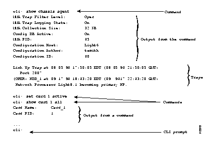 From the CLI, you can access any LS2020 switch in the network and perform network operations on that switch. To issue a CLI command, type the command, then press Return. Output is displayed on the screen. Error messages or traps may be displayed on a separate terminal or window, or they may be interleaved with the CLI commands and their output. Figure 2-1 shows a sample CLI session with traps interleaved with the commands and output.