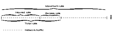 In this case, the network administrator sets the insured rate to accommodate the largest traffic rate expected under routine conditions and sets the maximum rate to accommodate the largest non-routine traffic rate. With these settings, all traffic within the insured and burst rates uses allocated bandwidth, and all traffic between the insured and maximum rates uses best effort bandwidth.