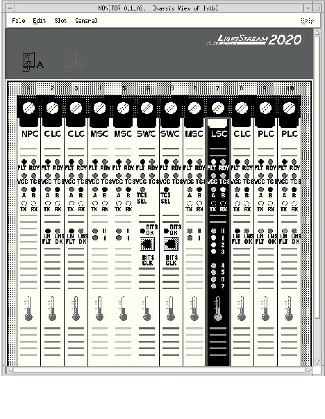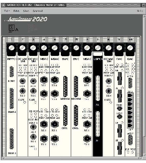 This chapter also provides the monitoring procedures for the CLI, the LS2020 monitor and the LS2020 topology map. The monitor displays a graphical representation of an LS2020 switch, its cards and ports, and the topology map displays a graphical representation of the LS2020 network.