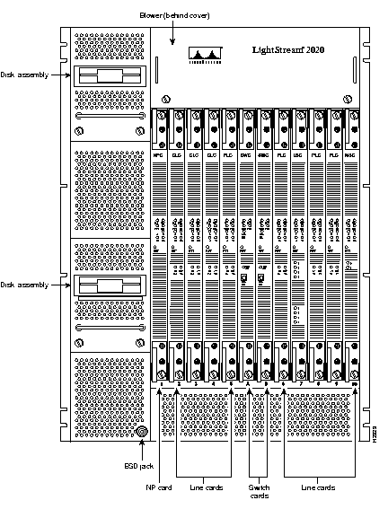 From the front of the LightStream 2020 chassis, you have access to network processor cards, line cards, switch cards, disk drive units, and one of the two blowers. Power supplies, access cards, external cabling, connectors for consoles and modems, and the other blower are accessible from the rear of the chassis.