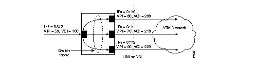 In Figure 6-4, cells entering the switch at the root point (on the left side at interface 0/0/0, VPI=50, VCI=100), are duplicated and switched to the leaf points (output interfaces), on the right side of the example.