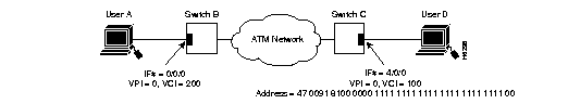 The following example allows User A to determine the destination ATM address of the interface connected to User D: