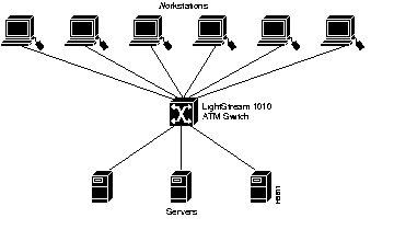 Figure 1-4 shows an example of a network configuration using the LightStream 1010 ATM switch in a high-performance workgroup.