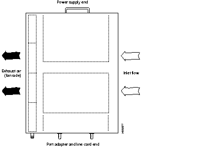 The fan tray draws cooling air in through the intake vent on the right side of the chassis (when viewing the router from the front [the port adapter and cable modem card end]), and moves the air across the internal components and out the exhaust vent on the left side of the chassis. Figure 5 shows the air flow through the Cisco uBR7246 universal broadband router.