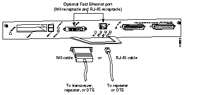 The Fast Ethernet port on the I/O controller has a single MII, 40-pin, D-shell type connector that is configurable for 100 megabits per second (Mbps). The MII connector supports IEEE 802.3u interfaces compliant with the 100BASE-X and 100BASE-T standards. The single MII connection requires an external transceiver that permits connection to multimode fiber for 100BASE-FX or 100BASE-T4 physical media (refer to Figure 3-14).