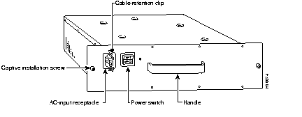 There are bays for up to two AC-input power supplies. The Cisco uBR7246 will operate with one power supply. While a second power supply is not required, it allows load sharing and increased system availability.