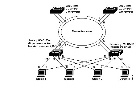 A WS-C1400 concentrator in dual-priority attachment mode functions like a concentrator that is in dual-attachment mode, except that the A or B ports must be active before any master (M) port can connect. If the A or B ports are not active, the M ports will report as inactive and are disabled until either the A or B port becomes active.