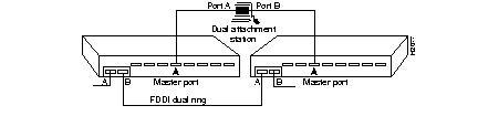 You can also connect a dual attachment station in the redundant configuration called dual homing. In Figure 1-4, a dual attachment station is connected to two concentrators that are connected to the dual ring. Port A on the station is the backup connection and only becomes active if the primary connection (port B) fails.