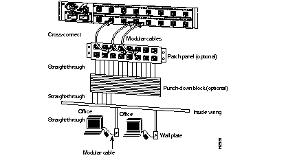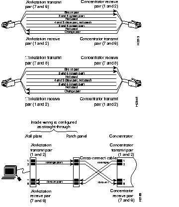 Figure F-4 shows the location of straight-through and cross-connect cabling for CDDI installations. Note that the cross-connect cabling is used between the concentrator and the patch panel.