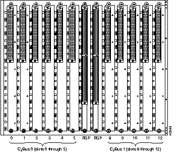 The dual CyBus has 13 slots: interface processor slots 0 through 5 (CyBus 0); two RSP slots (slots 6 and 7); interface processor slots 8 through 12 (CyBus 1), as shown in Figure 1-9.