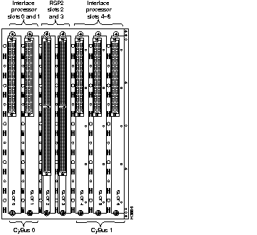 The dual-CyBus backplane provides the physical connections for the RSPs and interface processors, and transfers information at up to 2.134 Gbps (1.067 Gbps per CyBus). The dual CyBus has seven slots: interface processor slots 0 and 1 (Cybus 0), RSP slots 2 and 3, and interface processor slots 4 through 6 (CyBus 1), as shown in Figure 1-6.