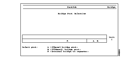 The Bridge Port Selection menu and Bridge Port Statistics Report reflect the physical positions of the BMM ports. BMM ports are identified from left to right as port A (10BaseT) and port B (100BaseT).