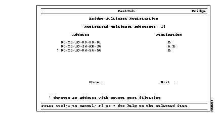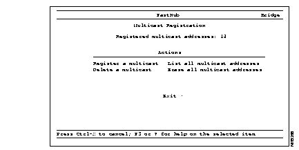 Register a multicast--Register or replace a multicast address. You are prompted for the multicast address to register and the list of ports where frames destined for the registered address are forwarded. Enter the address using six hexadecimal octets, in the format hh hh hh hh hh hh.