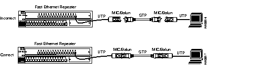 To prevent potential loopback problems on your network, make sure that the MIC connectors and baluns are never left unconnected when they are part of a link connected to a Fast Ethernet repeater (see Figure 3-11).