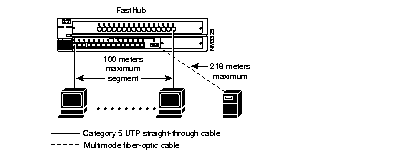 If all of the Cat 5 UTP-cable segments connected to the FastHub are less than 100 meters, the length of the fiber cable segment can be increased. See the "Extended and Multivendor Configurations" section for more information.