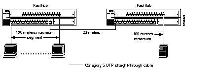 The maximum Cat 5 UTP cable segment length is 100 meters. When stations are connected to the FastHubs with 100-meter Cat 5 UTP cable segments, the Cat 5 UTP cable connecting the two FastHubs is limited to a distance of 23 meters, as illustrated in Figure 3-3.